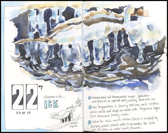 Tips and Techniques– When you sketch directly from nature, you also experience it in ways that working solely from a photo cannot offer. Frigid wind, rushing water, and awkward footing meant I had about 15 minutes to complete a base drawing and take a reference photo before retreating to the house to paint and do some research. Had I simply taken a photo and sketched entirely inside, my drawing would have been neater, but I would not have looked as carefully or felt so keenly the cold beauty of the stream in winter.