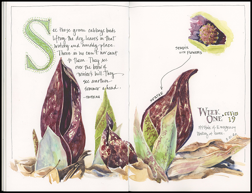 Tips and Techniques– Which came first, skunk cabbage or Thoreau? I typically go out and sketch what I find outside and then follow up with research. I look up some natural history information about what I’ve drawn, and sometimes look for a relevant quote or poem. I’ve been thinking all week about the role of art in times of struggle, and about how to record and express some of what I’m feeling. Finding Thoreau’s quote, written in 1857, could not have been more fitting.