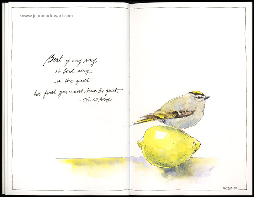 No bigger than a small lemon, and with an equally yellow cap, the golden crowned kinglet is a tiny harbinger of spring. Never still for more than a few seconds, it flits busily among the trees, its high-pitched song easier to hear than the bird itself is to find. So I sit quietly, binoculars in hand, and wait. Soon enough, several appear—and disappear, and appear again, in a game of hide and seek that goes on for most of the afternoon. I can’t capture the movement, so I go for the lemon and the bird and the quiet instead, happy to keep this reminder of the day between these pages.