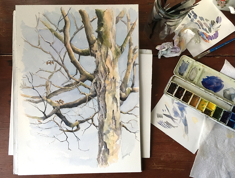It’s the perfect time of year for painting trees. Bare bones and branches, I like the unobstructed view, when limbs, bark, and shapes are revealed. This old maple in my front yard is interesting from almost any angle. I started mid-afternoon in glowing light but, because the sun faded quickly, it took me several days—and patience waiting for the right light again– to finish.