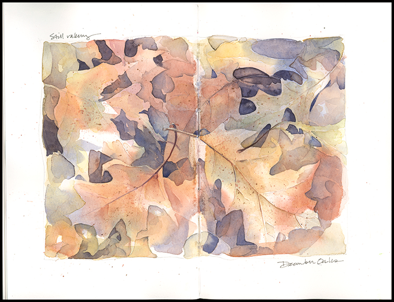 Tips & Techniques– I’m testing a new box of Schmincke watercolors, so I decided to use “negative” painting techniques with this journal page as a way to figure out the range of colors I could get with a triad of Ultramarine Blue, English Venetian Red, and Yellow Ochre. I began with a very loose wet-in-wet wash of those three colors. Once it dried, I began to pick out the shapes of the leaves with smaller, but still very wet washes. You can lay lots of layers on top of one another with this technique to build values, depth and interest. The trick is to stop before overworking it or losing the spontaneity of the original wash.