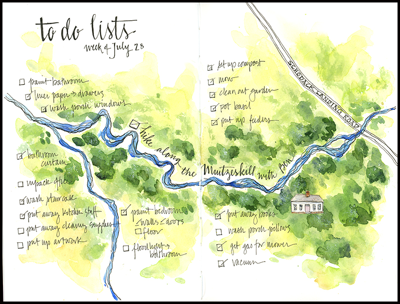 What to do when your TO DO list is longer than the hours in a day? When “unpack office/studio” makes the list of chores necessary for settling into a new house, but doesn’t yet rise in priority? When painting walls takes precedent over painting watercolors? My solution: make a simple sketch and go wash the bedroom floor. Still, I can’t complain. I’m settling into a beautiful place and managed to take time to explore the stream and woodland that runs alongside and beyond the house. And I trust that there will be days—and years—ahead for putting more of this lovely place on paper.