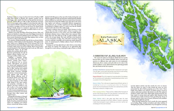 Ever wonder what it’s like to go power cruising in southeastern Alaska—snaking your way through miles of evergreen coastline dotted with remote fishing villages? To be honest, I never have. I don’t even own a boat. So when I got an email asking whether I would illustrate an article on cruising and salmon fishing for PassageMaker magazine, I took a deep breath and enthusiastically accepted. Mind you, I didn’t get to actually go to Alaska. I just got to bring someone else’s travels to life in journal style illustrations for the article. The April issue hit the stands this week, and while I can’t show it to you in detail, I can give you a sneak preview.