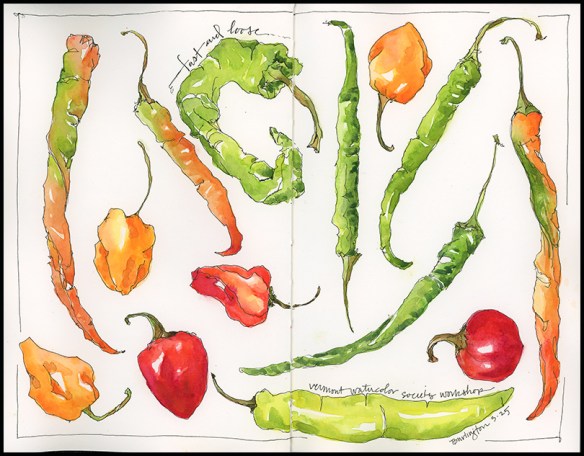 I introduced this technique with participants at a recent workshop on illustrated watercolor journaling that I offered at the Vermont Watercolor Society. Look how great this 1-minute sketch by one of the participants turned out with a just a couple of washes of watercolor.