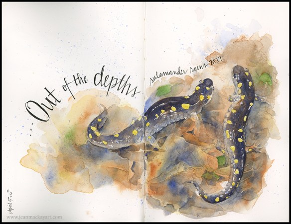 Tips & Techniques- Don’t try to draw in the dark in the rain. Take a photo. I began this page with a pencil drawing compiled from two photos. I painted the yellow spots and used masking fluid to save them and some of the highlights. I then did a wet in wet wash of ultramarine blue, burnt sienna, and yellow ochre over the whole thing (the entire painting is just those three colors, with a touch of sap green and quin gold at the end). I used negative painting techniques for most of this, pulling out bits of leaves on the ground and the shapes of the salamanders.