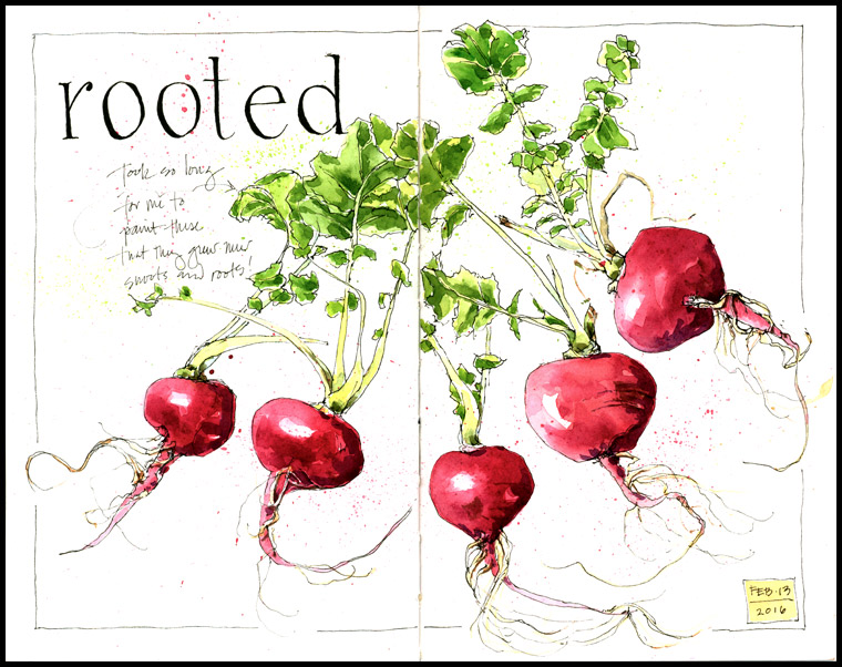 I had the pleasure and privilege of teaching a full day workshop on Illustrated Watercolor Journaling at the Killington Arts Guild in Vermont last weekend. I’m always inspired by the creativity and enthusiasm that comes from gathering people together for a day of painting! I don’t usually paint much when I’m teaching, but I started this beet as part of a demonstration and then finished it back at home. I always aim to make my journal pages reflect something meaningful or interesting from my experiences, so I finished the page with some… Read More