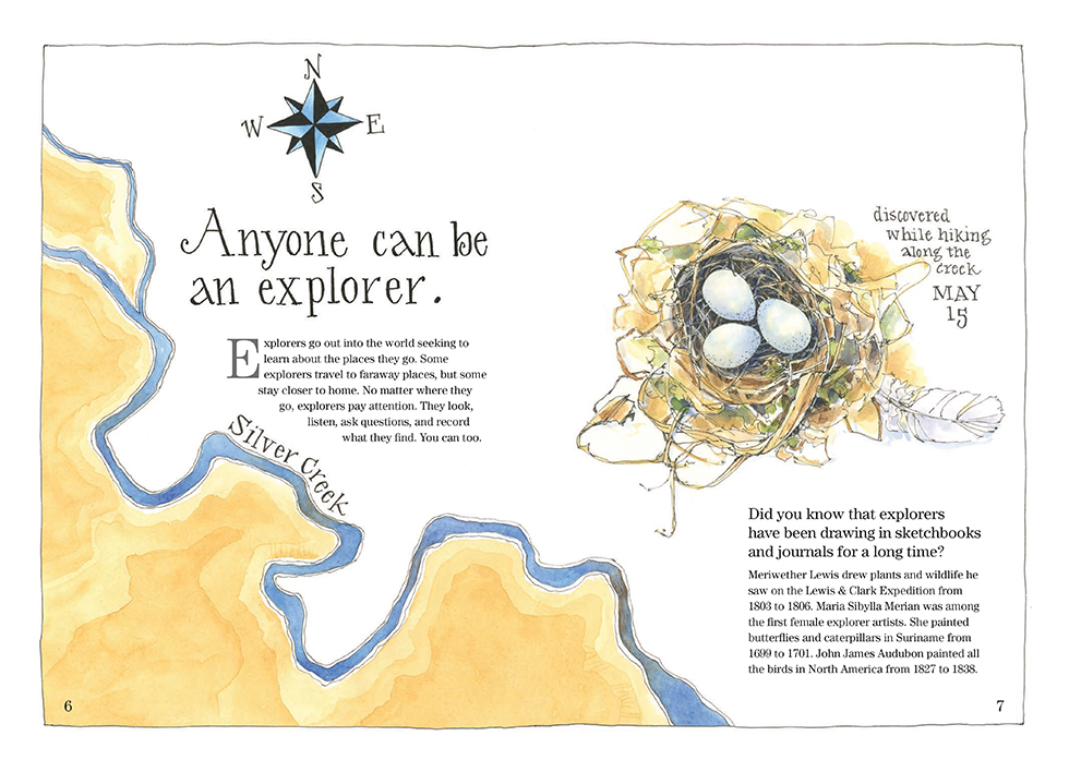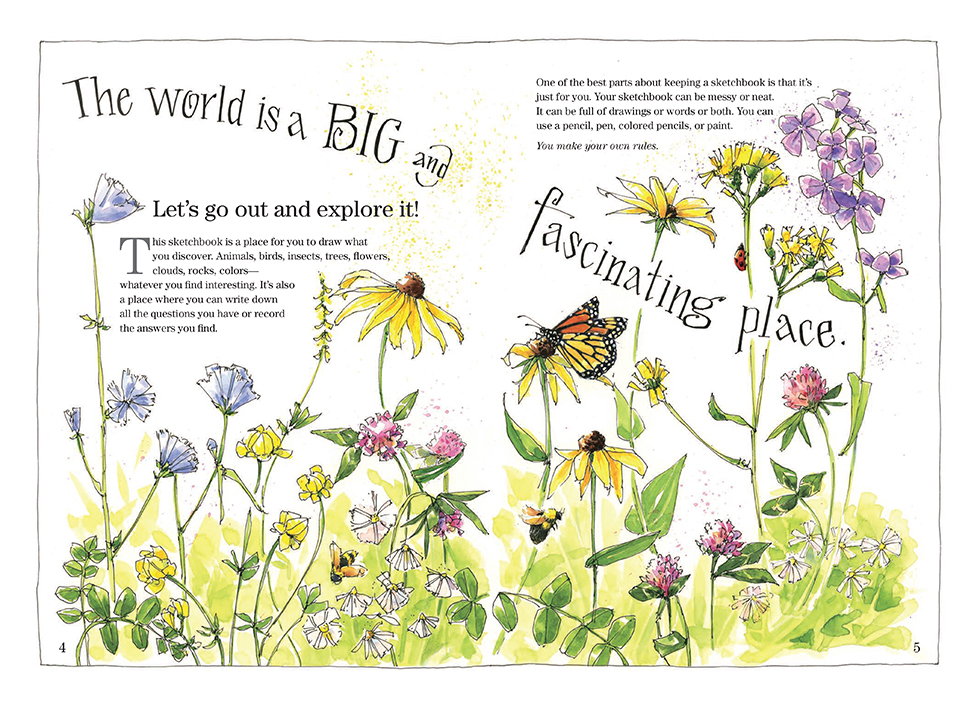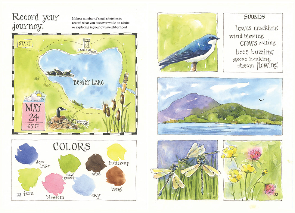 The first 27 pages of this 80-page journal contain inspiration for what to record in art and words, along with simple instructions for how to do so. Each spread in this section focuses on one topic, such as pencil drawing, adding color, writing down questions, or recording your journey. Small text boxes highlight “Try This” ideas explorers can use to develop their nature journaling techniques. The remaining pages offer additional “Try This” exercises every five pages or so, sprinkled among blank pages for drawing, sketching, painting, and writing, some of which have smaller boxes to frame smaller sketches. The texture of the pages and their soft eggshell color make this book feel like a true artist’s delight. The guidance and exercises strike the perfect balance of encouragement and instruction, allowing explorers to observe, discover, and appreciate the natural world starting from where they are—and to try again if they aren’t satisfied with their results. There are instructions for sketching birds and insects, breaking down the body parts for artists to copy. The sample artwork throughout is skillful and beautiful but not intimidating; the visible strokes of pencil and brush imply that results can vary with attention and practice.